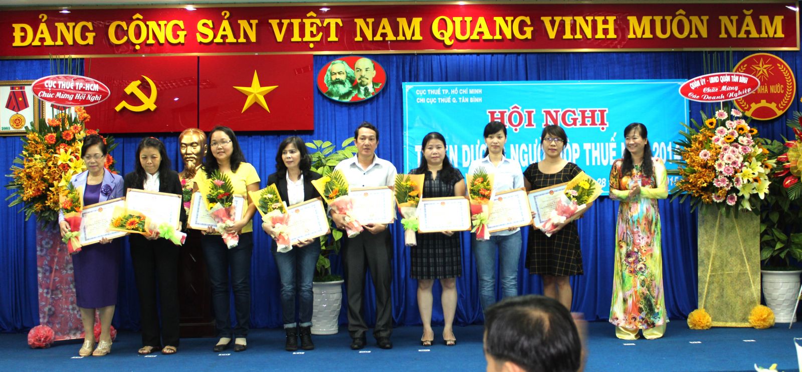 Để tuyên dương những kết quả đạt được, Chi cục Thuế quận Tân Bình đã xem xét đề nghị các cấp khen thưởng năm 2014 cho gần 100 người nộp thuế tiêu biểu gồm Bằng khen của Bộ Tài chính, Bằng khen của UBND TP.HCM và Giấy khen của Chi cục Thuế quận Tân Bình.