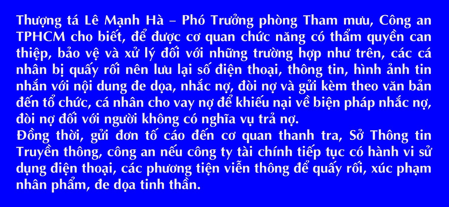 Suốt thời gian sau đó anh S liên tục bị thúc ép trả nợ, ban đầu anh S chuyển trả nhưng khi thấy số tiền trả đã hơn 3 triệu thì anh không trả nữa, từ đó anh S đã “không có ngày bình yên” do liên tục bị gọi quấy rối, đe dọa, khủng bố, ép trả và thậm chí là nhận nợ. Vì liên tục bị gọi quấy rối, đe dọa, khủng bố, ép trả và nhận nợ nên anh S đã hủy bỏ số điện thoại. Lúc này đối tượng cho vay bắt đầu chuyển sang nhắn tin cho lãnh đạo công ty với lời lẽ xúc phạm, ngôn từ vô văn hóa mặc dù việc vay tiền của anh S không liên quan đến cá nhân lãnh đạo cũng như đối với công ty mà anh S đang làm việc.