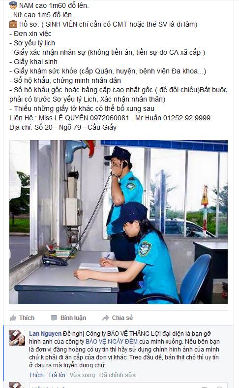 Bảo vệ Vina Long Hoàng, sử dụng hình ảnh của bảo vệ Ngày & Đêm để đăng tuyển dụng