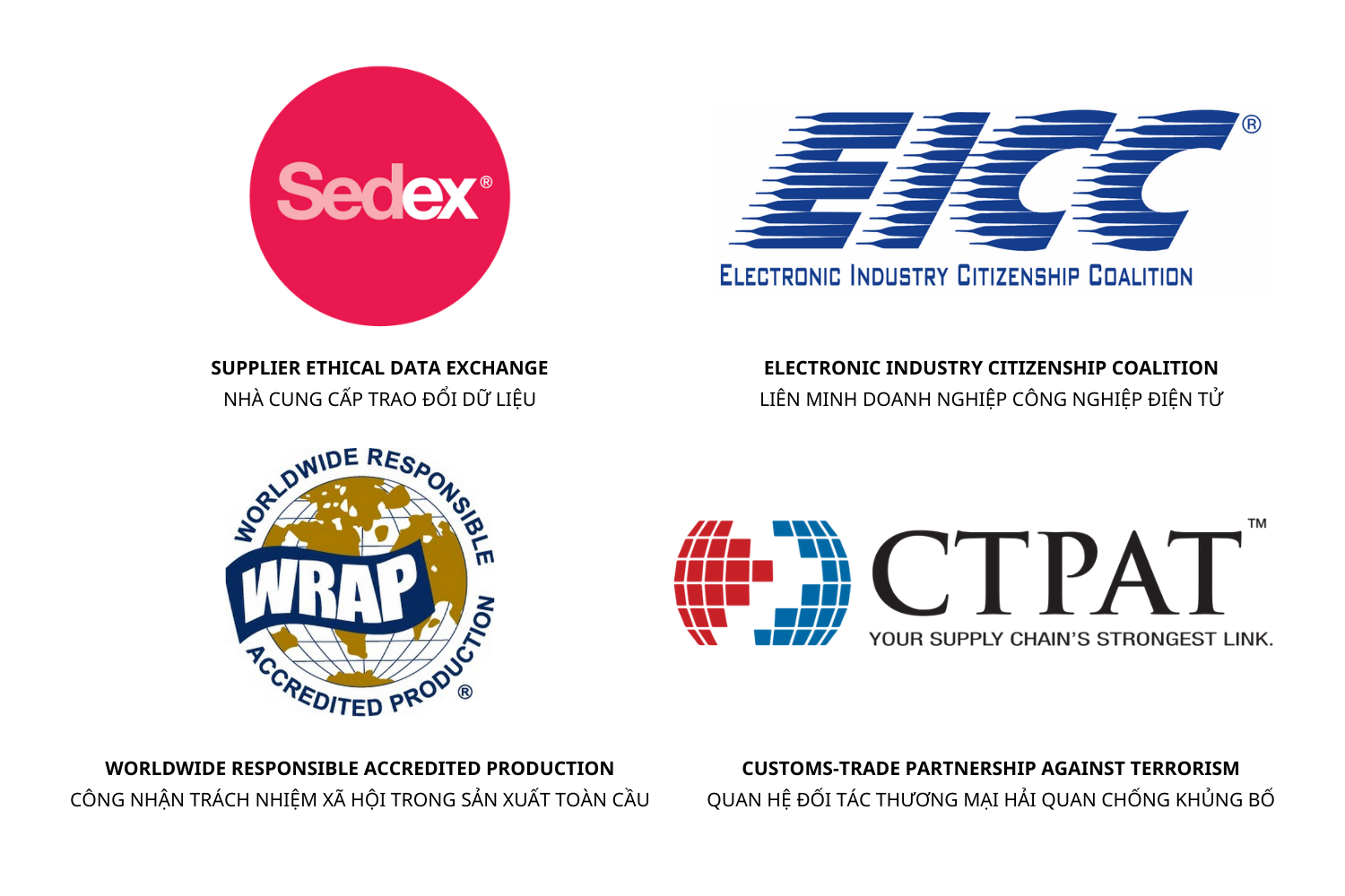 – Tiêu chuẩn quốc tế: WRAP, CTPAT, SEDEX, EICC,…