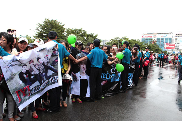 By NDS media: Regardless of abnormally rainy and sunny weather of Saigon, hunders of fans inclusive of fans from Korea and Europe have been waiting from 09:00am to 13:00pm on 29 Aug., 2014 at VIP gate of Tan Son Nhat Airport, HCM City to welcome the hit band JYJ to Vietnam for its performance.